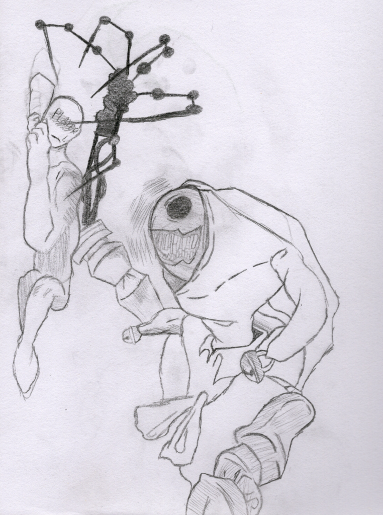 The main reason why I drew this, was for a friend, but I thought of drawing it a while ago. this took me a while, and by a while I mean around 5 hours. Which doesn’t sound like a lot for this drawing, but it did take me that long, as I rubbed out, struggled, and shading a lot. I would say I fumbled a lot, especially on the player, the hand, and the jester-type hood. You just have to flip the screen around to see this, which is ashame as it would’ve looked great if it was already on the correct side!